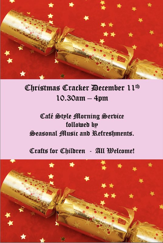 Sunday 11 December: Christmas Cracker As part of the annual Dorchester Christmas Cracker, the 10.30am Sunday Service will be in a more informal café style, and the church will then be open from 12 noon to 4pm for community carol singing with a choir and brass ensemble. There will be craft activities for children, and we will be serving teas, coffees and seasonal refreshments. All are very welcome.