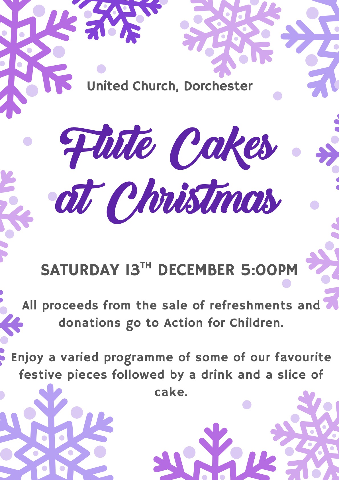 Saturday 13 December: Flute Cakes Concert Flutecakes will be presenting a concert of their favourite festive music on Saturday 13th December at 5pm at the United Church, in aid of Action for Children. Entry is free but there will be a retiring collection and refreshments - so do come along for some lovely music followed by a drink and a slice of cake!.