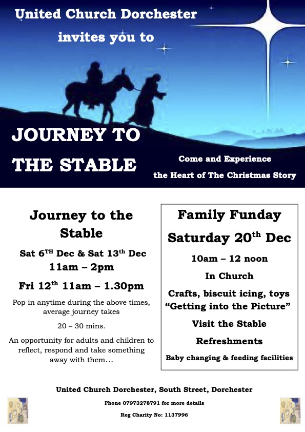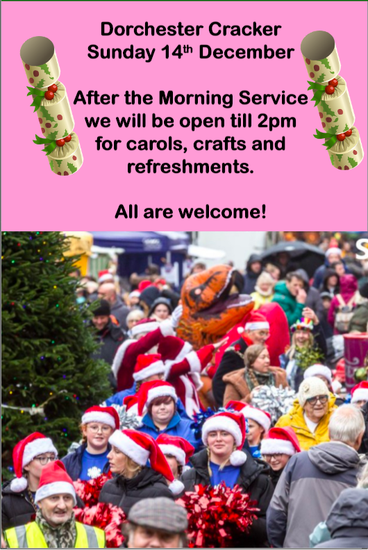Sunday 14 December: Christmas Cracker As part of the annual Dorchester Christmas Cracker, following the 10.30am Sunday Service, the church will be open from 12 noon to 2pm for community carol singing, craft activities and mince pies. We also encourage our members and visitors to engage in the other Cracker Day events which are taking place across the centre of town.