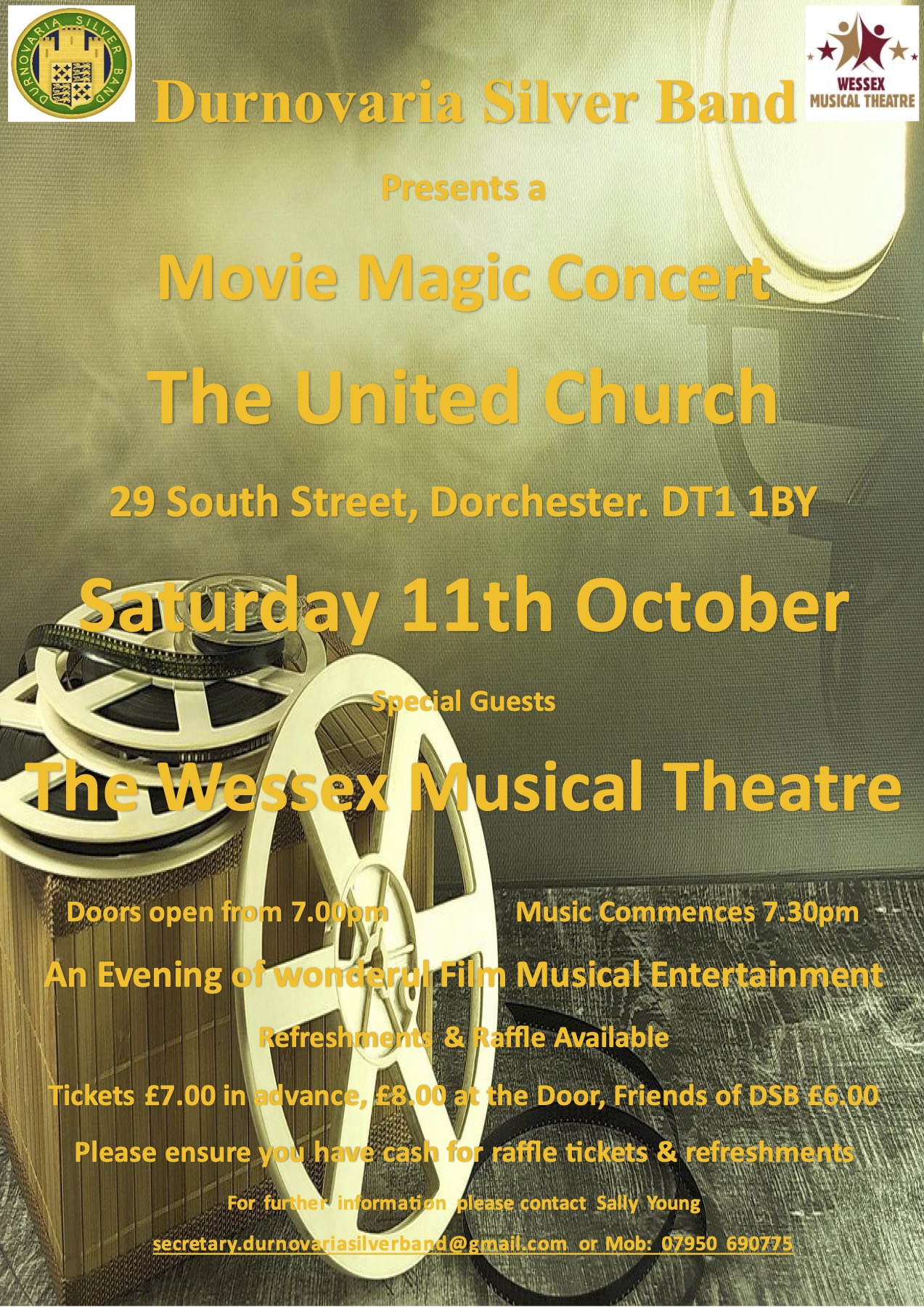 Saturday 11 October 7.00pm for 7.30pm start: Movie Magic Concert Durnovaria Silver Band will be joined by Wessex Music Theatre for an evening of wonderful film musical entertainment. Tickets are £7 or £8 on the door. There will also be a raffle, and refreshments – please make sure you have cash for both! For further information, please contact Durnovaria’s secretary Sally Young.