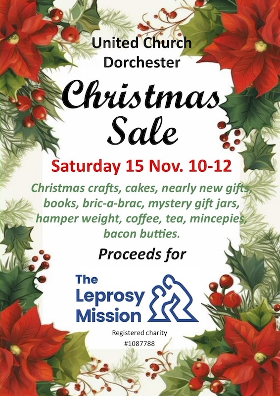 Saturday 15 November, 10.00 – 12.00: Christmas Sale Come along and support The Leprosy Mission at this Christmas Sale. There will be Christmas crafts, cakes, nearly new gifts, books, bric-a-brac, mystery gift jars, and guess the hamper weight. Refreshments will include coffee, tea, mincepies – and bacon butties!