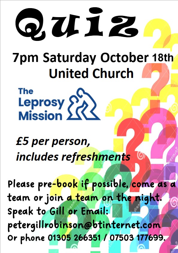 Saturday 18 October 7.00pm: Quiz for Leprosy Mission Come and support the UCD World Church Project (Leprosy Mission) by taking part in this Quiz at United Church Dorchester. £5 per person - come as a team (max 6 people) or join a team on the night. Coffee/tea and cake will be provided. Please pre-book if possible by contacting Peter or Gill Robinson: you can send them an email via the UCD Contact Form.