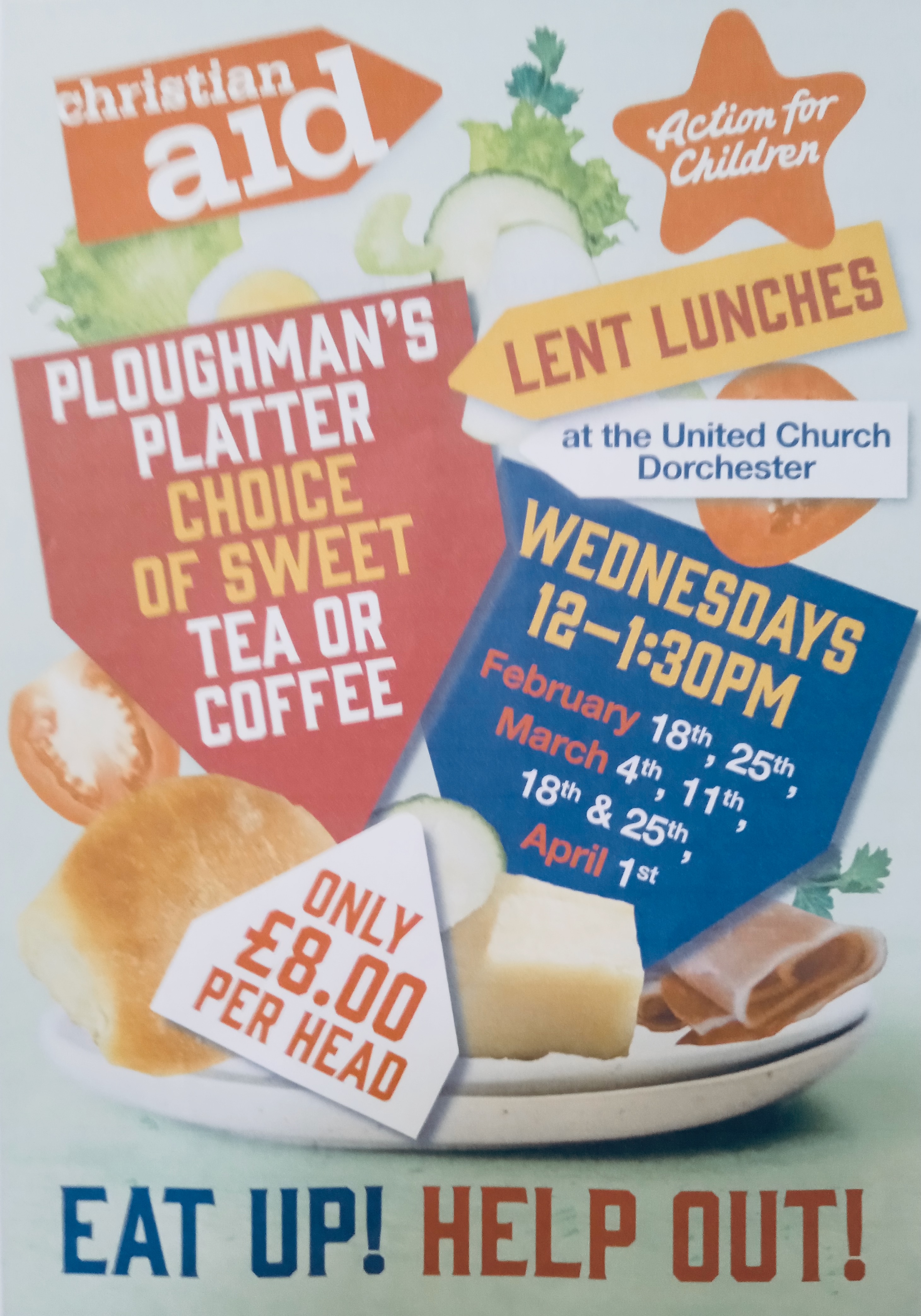 Wednesdays 18th February – 1st April, 12 noon – 1.30pm: Lent Lunches This year Ash Wednesday will be the 18th February, and we shall serve Lent lunches for seven weeks from then until Easter. Every Wednesday from 12 noon until 1.30pm, Sue Gannaway and her team of helpers will serve a variety of salads and a delicious selection of desserts, all accompanied by a cup of tea or coffee. The lunches will be served in the hall immediately after the Coffee Morning. Why not come along and enjoy a lovely meal in good company? The charge is £8, with all profits going to Christian Aid and Action for Children.