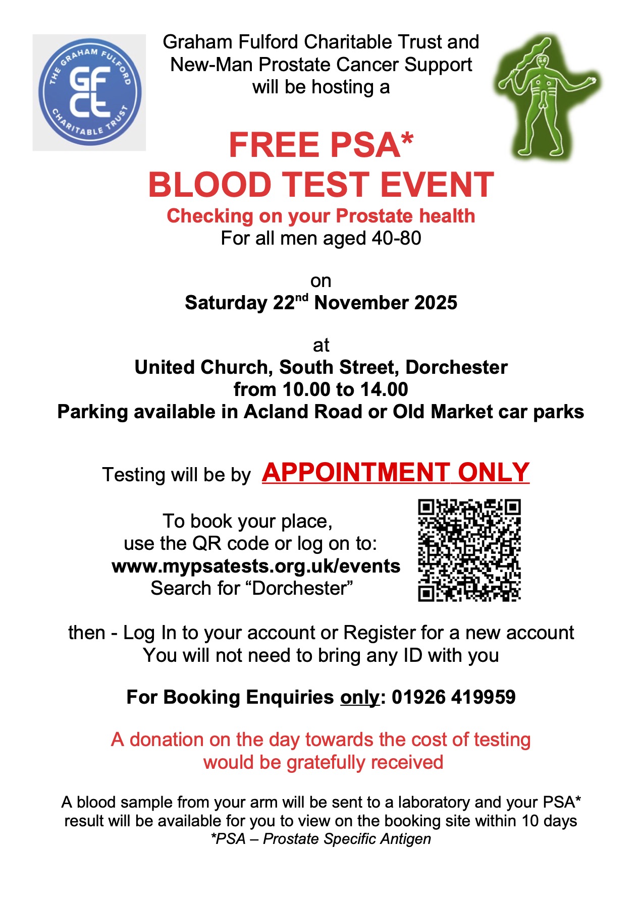 Saturday 22 November 10.00am – 2.00pm: PSA Blood Test Event Graham Fulford Charitable Trust and New-Man Prostate Cancer Support are joining together to offer the chance for any man aged 40 – 80 to have a free Prostate blood test: visit the Mypsatests website, and then either Log in or Register for an account to book a test. PSA testing is a valuable tool in the early detection of prostate cancer. The group averages a detection rate for evidence of cancer in around 10% of the men who come forward for testing at these events, sending them on to GPs and specialists for further investigation. They expect a take-up of 200 men, so potentially saving, or at least prolonging, 20 lives.