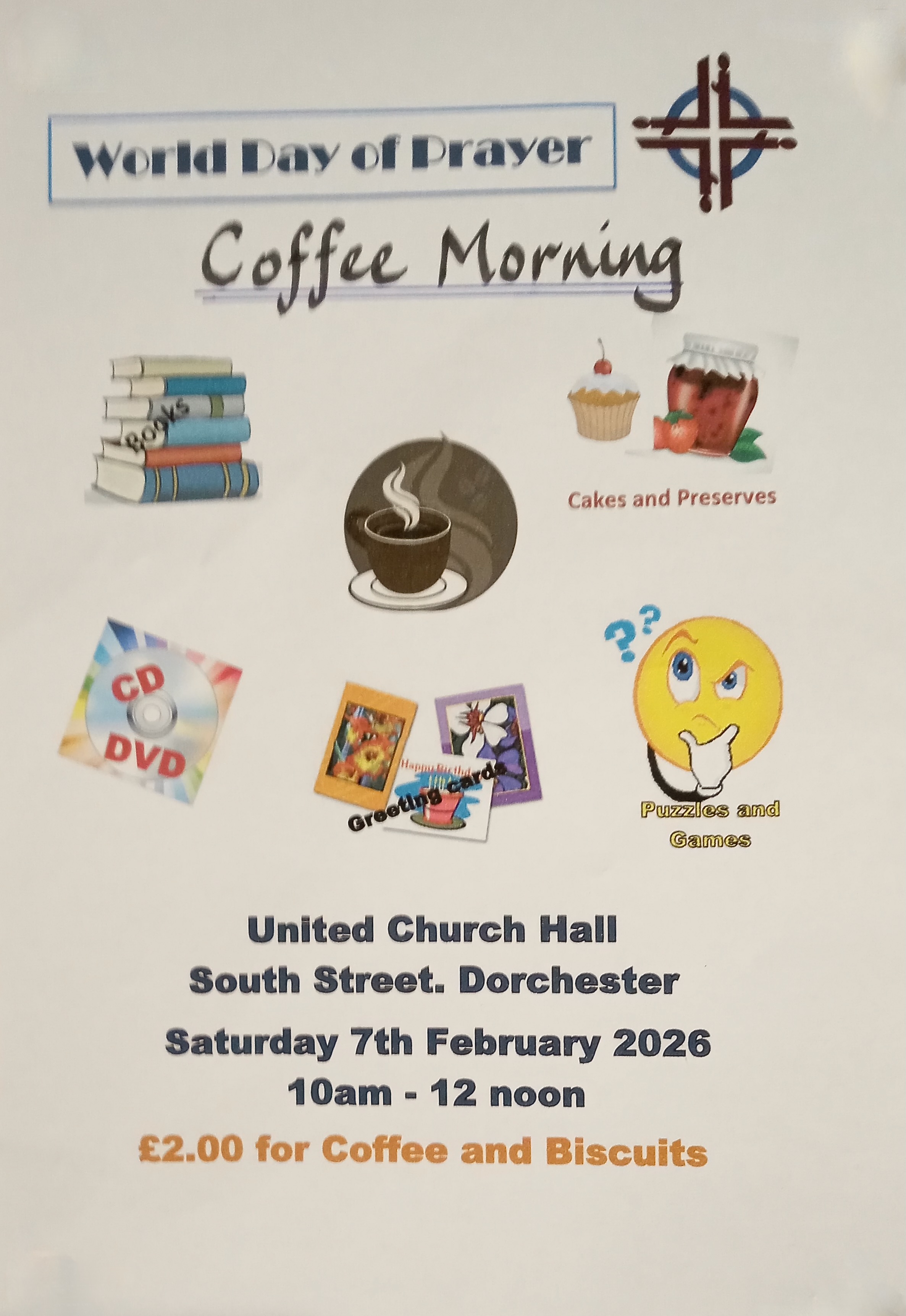 Saturday 7th February, 10.00am – 12.00 noon: World Day of Prayer Coffee Morning In support of the 2026 World Day of Prayer (with services taking place around the world on 6 March), there will be a Coffee Morning on Saturday 7 February at UCD to raise funds which can support the projects of health, education, mission and other charities to which the World Day of Prayer movement give grants. Come and join us for refreshments (just £2), and to buy from the many stalls that will be there. You may also be interested in the local World Day of Prayer service taking place on Friday 6 March at 10.30am in the United Church, Dorchester.