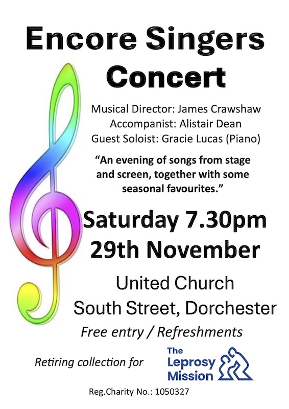 Saturday 29 November 7.30: Encore Singers The Encore Singers, under the direction of James Crawshaw, and with guest soloist Gracie Lucas, will provide an evening of songs from stage and screen, together with some seasonal favourites. Entry is free, with a retiring collection for The Leprosy Mission.