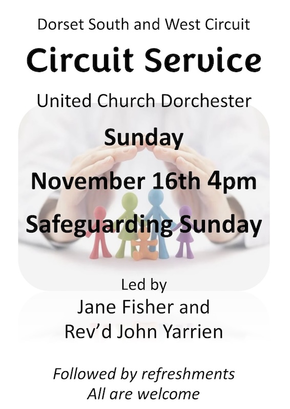 Sunday 16 November, 4.00pm: Circuit Service for Safeguarding Sunday Everyone is invited to join us on Sunday 16th November 2025, 4 pm at UCD, for a Dorset South and West Circuit Service to mark this year's Safeguarding Sunday. This service will be led by Jane Fisher (Regional Officer for Safeguarding - South West (Southampton) | The Connexional Team) and Revd John Yarrien, and will be followed by refreshments. Safeguarding Sunday is supported by the charity thirtyone:eight. The charity works to ensure that churches can continue to play an important role in their communities, offering support to many vulnerable groups. It also raises local awareness of the importance of safeguarding and to celebrate the positive steps already being taken by churches to counteract the appalling historic abuse that has taken place within many institutions, including the church.